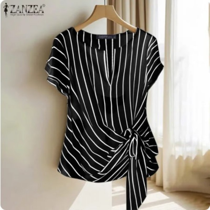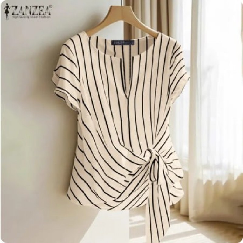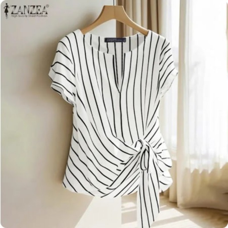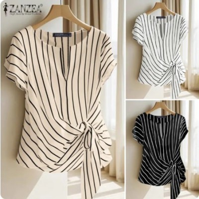 ZANZEA wanita pejabat v-neck Raglan lengan blaus Stripe cetak Knotted Work Thin Top #0421 24.9 |