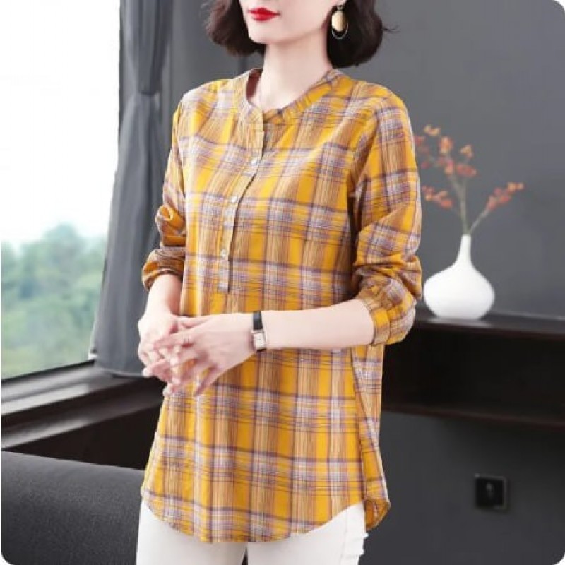 Baju Blaus Katun Gaya Musim Gugur Wanita Baju O-Neck Wanita Tombol Lengan Panjang Kotak-kotak Tops Korea Elegan