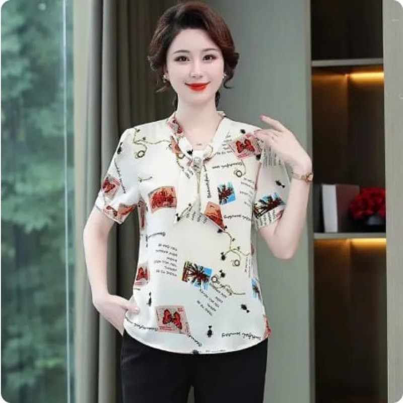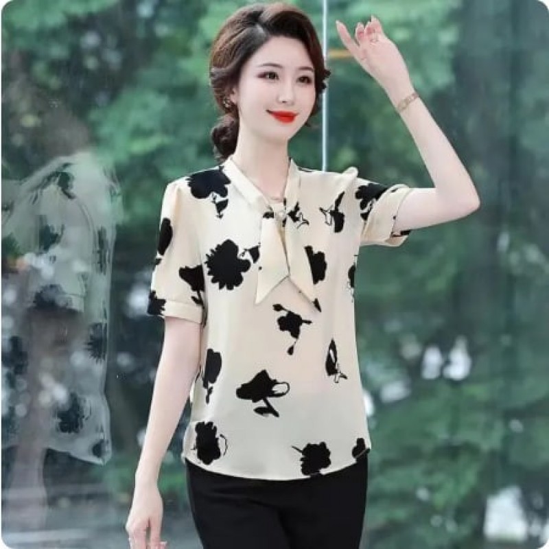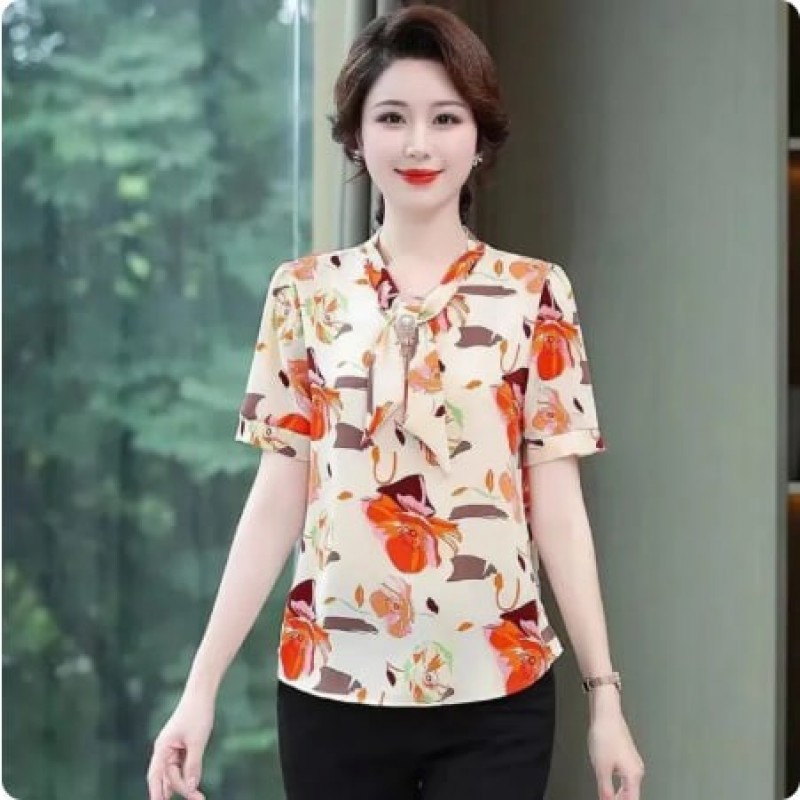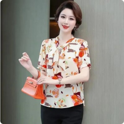 Wanita pendek sleeve Chiffon Shirt kasual v-neck Tie Floral Blouse kemeja t musim panas fesyen baru serba boleh longgar pemasangan pertengahan umur dan tua atas