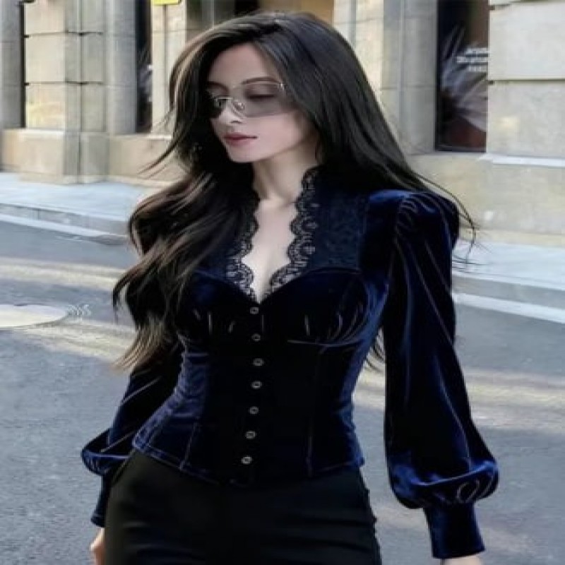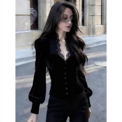 Black Velvet Shirt Women's Style Slim Fit Long Sleeve V-Neck Fashionable Age-Defying Elegant Waist-Cinching Top