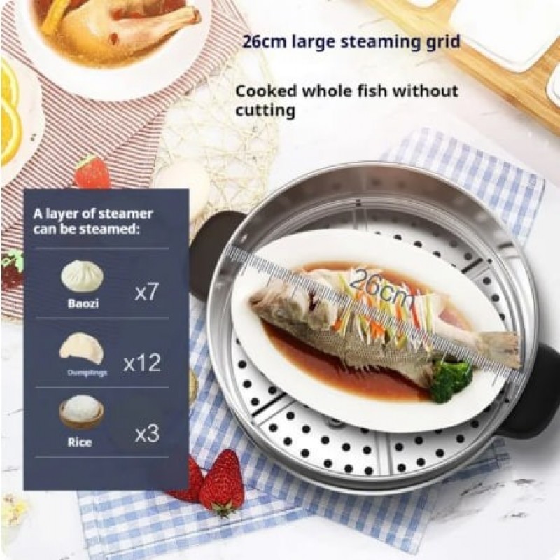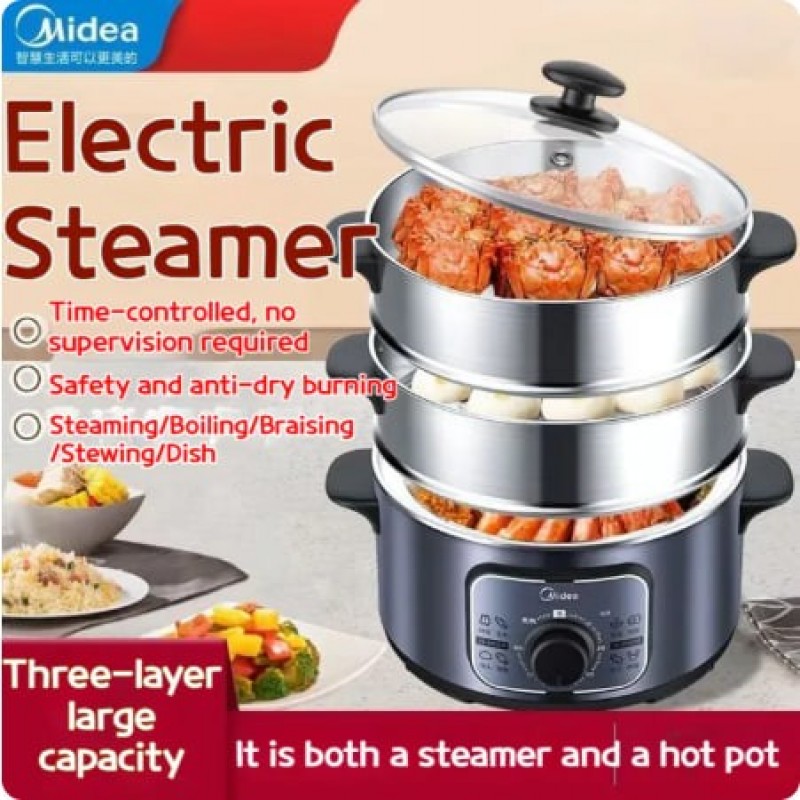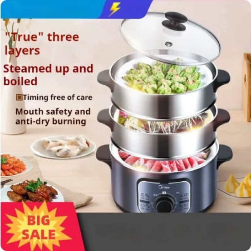 (Palam Malaysia) Pengukus Elektrik Midea Tiga Lapisan 12L Kapasiti Besar Pelbagai Fungsi Periuk Keluli Tahan Karat Kawalan Masa Memasak Makanan Kukus